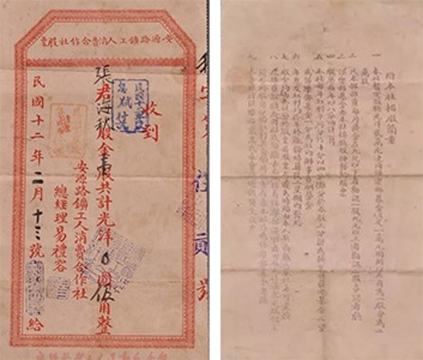 江西萍鄉(xiāng)煤礦自1898年開辦起,安源工人便在經(jīng)濟(jì)上深受剝削,礦局拖欠工資,奸商哄抬物價(jià)。為了維護(hù)工人利益,減少商人的中間盤剝,1922年5月中國(guó)共產(chǎn)黨領(lǐng)導(dǎo)的安源路礦工人俱樂(lè)部成立不久,便于同年7月創(chuàng)辦了中國(guó)工人階級(jí)最早的經(jīng)濟(jì)組織——安源路礦工人消費(fèi)合作社。隨著規(guī)模和經(jīng)營(yíng)范圍進(jìn)一步擴(kuò)大,消費(fèi)合作社流轉(zhuǎn)資金嚴(yán)重不足,出現(xiàn)了貨品短缺的窘境。為了解決資金不足的問(wèn)題,1923年初,消費(fèi)合作社決定在俱樂(lè)部部員中招股,制定了《招股簡(jiǎn)章》。工人們深信消費(fèi)合作社就是為大家謀利益的經(jīng)濟(jì)實(shí)體,盡管十分困難,仍踴躍認(rèn)購(gòu)股票,很快就籌集到股金7800余元,連同俱樂(lè)部撥來(lái)的活動(dòng)經(jīng)費(fèi)一起,共計(jì)資金1.8萬(wàn)余元。消費(fèi)合作社給每位認(rèn)股者發(fā)了自行設(shè)計(jì)的股票作為憑證。