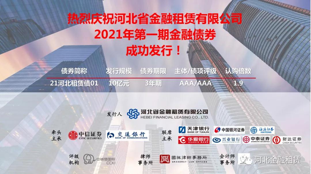 日前,河北省金融租賃有限公司(以下簡稱“河北金租”或“公司”)成功發行2021年第一期金融債券,本期債券由中信證券和交通銀行為牽頭主承銷商,獲得了各家金融機構的積極認購,發行規模10億元,期限3年。此次債券的圓滿發行進一步在市場樹立了河北金租穩健進取、持續發展的形象。