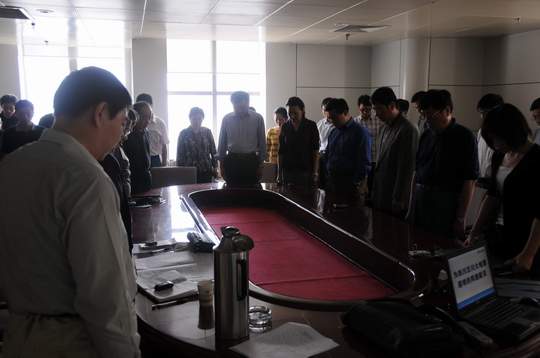 2008-07-015 月 19 日 ,下午 2 : 28 舉國默哀三分鐘。河北金租會議室,默哀氣氛莊嚴肅穆,只聽窗外汽笛齊鳴,于是心有感念:愿生者堅強振作,早日重建家園,死者則安心長眠,天堂沒有地震。