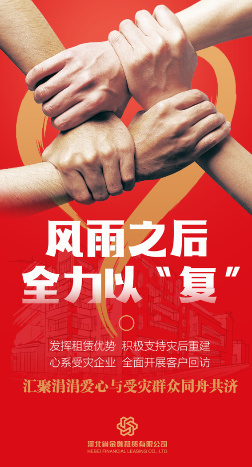 2023-09-21風(fēng)雨之后,是災(zāi)后重建的關(guān)鍵時(shí)期。河北省金融租賃有限公司(以下簡稱“河北金租”或“公司”)全力落實(shí)各級(jí)政府及監(jiān)管部門的決策部署,及時(shí)出臺(tái)針對(duì)性政策,迅速投身災(zāi)后重建工作,積極幫助受災(zāi)地區(qū)企業(yè)解難紓困,以實(shí)際行動(dòng)踐行金融工作的…